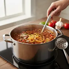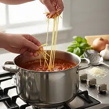 Now the key moment! Break the spaghetti in half to fit it in the pot. Spread it evenly in the boiling sauce, trying to ensure as many strands as possible are submerged. Cover the pot with a lid and cook for about 2 minutes. After this time, remove the lid and, using tongs or a fork, thoroughly mix the pasta, separating the stuck strands. Make sure all the pasta is submerged in the sauce.