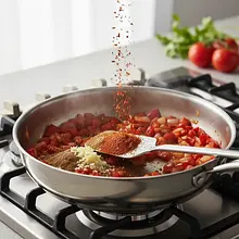 Add the chopped garlic, cumin, smoked paprika, and optionally chili flakes to the sautéed vegetables. Stir and fry everything together for about 30-60 seconds until you can smell the intense, spicy aroma. This step 'opens' the flavor of the spices.