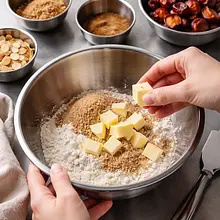 In a bowl, combine the flour, remaining brown sugar (35 g), 40 g of cold diced butter, and toasted almonds. Rub the ingredients together with your fingers or use a knife to chop the butter into the flour until uneven, moist clumps resembling wet sand form (about 3–5 minutes).