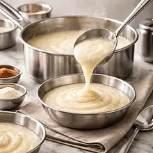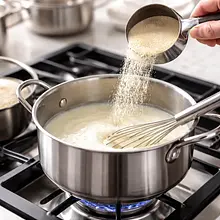 Reduce the heat to low. Slowly, in a thin stream, sprinkle the semolina into the milk, constantly stirring with a whisk or wooden spoon to avoid lumps. After adding all the semolina, cook on low heat for 4–6 minutes, stirring continuously, until the cream thickens and becomes smooth (it should hold its shape on a spoon and not be watery).