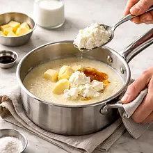 Remove the pot from the heat. Add 40 g of butter, ricotta (200 g), vanilla extract (5 g), the remaining white sugar (if you want a sweeter cream), and a pinch of salt to the hot semolina. Stir vigorously until the butter melts and the ricotta combines, creating a thick, creamy pudding. Taste and sweeten if necessary.