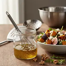 While the pumpkin is baking, prepare the dressing. In a small jar with a lid, pour in the remaining olive oil (about 45 ml), balsamic vinegar, liquid honey, and add Dijon mustard. Season with a pinch of salt and pepper. Close the jar and shake it vigorously for about 30 seconds. All the ingredients should combine to create a smooth, slightly thickened emulsion. Taste and add more salt, pepper, or honey if needed.