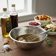 Tuż przed podaniem, jeszcze raz energicznie wstrząśnij słoikiem z sosem, aby ponownie go połączyć. Polej sałatkę przygotowanym sosem vinaigrette, rozprowadzając go równomiernie po wszystkich składnikach. Podawaj natychmiast, aby liście sałaty pozostały chrupiące.