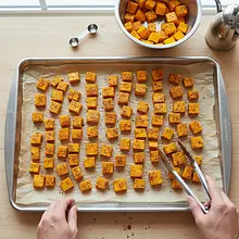 Dużą blachę do pieczenia wyłóż papierem do pieczenia. Rozłóż na niej przyprawioną dynię w jednej warstwie. Wstaw do nagrzanego piekarnika i piecz przez 20-25 minut. Dynia jest gotowa, gdy widelec wchodzi w nią z łatwością, a jej krawędzie są lekko zrumienione i skarmelizowane. Po upieczeniu wyjmij blachę z piekarnika i odstaw dynię do lekkiego przestygnięcia na około 10-15 minut.