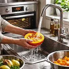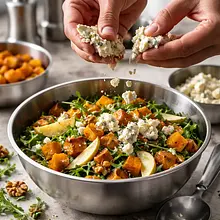 Preheat the oven to 200°C with the convection function (or 220°C top-bottom). Wash the pumpkin thoroughly under running water. Place it on a stable cutting board and cut it in half with a sharp, large knife. Use a metal spoon to scoop out the seeds and fibrous flesh from the center. Cut each half into slices about 1.5-2 cm thick. Line a large baking tray with parchment paper. Spread the pumpkin pieces in a single layer on it. Drizzle with one tablespoon of olive oil, sprinkle with a pinch of salt and pepper. If using, add sprigs of fresh thyme. With clean hands, mix the pumpkin with the spices thoroughly so that each piece is evenly coated. Place in the preheated oven and bake for 20-25 minutes. The pumpkin is ready when a fork easily goes into it, and its edges are slightly browned and caramelized. Remove from the oven and set aside to cool slightly.