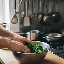 In a bowl with kale, add one tablespoon of olive oil (about 15g) and a large pinch of salt. Now perform the key action: 'massage' the kale leaves with clean hands for 2-3 minutes. Knead, rub, and squeeze the leaves as if you were kneading dough. You will notice that the kale will reduce in volume, become darker, softer, and more delicate in flavor.