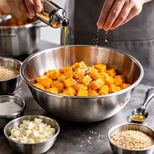 Preheat the oven to 200°C with the convection function (or 220°C top-bottom). Rinse the Hokkaido pumpkin thoroughly under running water. Since its skin is edible, you don't need to peel it. Cut the pumpkin in half, then use a large spoon to scoop out the seeds and fibrous flesh from the center. Cut the pumpkin halves into cubes about 2-3 cm on each side. Try to make the pieces similar in size so they bake evenly.