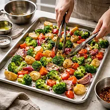 Preheat the oven to 200°C (conventional mode, no fan). Prepare a large baking tray and line it with parchment paper. The paper will prevent the vegetables from sticking, and the tray will be easier to clean.