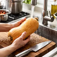 Thoroughly wash the pumpkin under running water. Place it on a stable cutting board. Use a large, sharp chef's knife to first cut off both ends of the pumpkin (about 1 cm from each side). Then, cut the pumpkin in half at the point where it widens into a 'pear' shape. Peel both halves using a sharp vegetable peeler. From the wider part, remove the seeds and fibrous flesh with a spoon. Cut the cleaned flesh into even cubes with a side of about 2 cm.