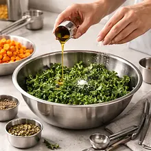 In a bowl with kale, add 15 ml (1 tablespoon) of olive oil and a large pinch of salt. Now perform the key step: 'massage' the kale leaves with clean hands for about 2-3 minutes. Knead and rub the leaves as if you were kneading dough. You will notice that the kale changes to a darker color, reduces in volume, and becomes much softer and more tender.