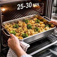 Place the tray in the preheated oven and bake for 25-30 minutes. Halfway through baking (after about 15 minutes), remove the tray and stir the pumpkin with a spatula to ensure even roasting. The pumpkin is ready when it is soft (a fork goes in easily) and has golden-brown, slightly caramelized edges. After baking, remove from the oven and set aside to cool slightly.