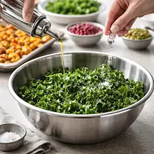 In a bowl with kale, add 1 tablespoon of olive oil (15g) and a large pinch of salt (1g). Now perform the most important step: massage the leaves with clean hands for about 2-3 minutes. Squeeze and rub the leaves as if you were kneading dough. You will notice that the kale will reduce in volume, become darker, softer, and more tender in flavor.