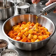 Preheat the oven to 200°C (top-bottom) or 190°C with fan. Prepare a baking sheet lined with parchment paper. Peel the pumpkin with a peeler (if the skin is tough), cut it in half lengthwise, scoop out the seeds with a spoon, and cut the flesh into cubes about 2 cm on each side. Peel the carrot, trim the ends, and cut it into diagonal slices about 7-8 mm thick or into pieces similar in size to the pumpkin, so they cook evenly.