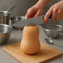 Wash the butternut squash. Cut off both ends with a sharp, large knife. Stand the squash upright on a cutting board and carefully cut it in half lengthwise. Use a spoon to scoop out the seeds and fibrous flesh from the center of both halves. Then, using a sharp vegetable peeler or a small knife, peel the skin. Cut the flesh into even cubes about 2 cm on each side.