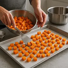 Preheat the oven to 200°C with the convection function (or 220°C without convection). Prepare a large baking tray and line it with parchment paper. The parchment will prevent the pumpkin from sticking to the tray, making cleanup much easier.