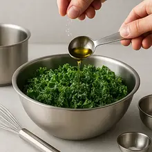 In a bowl with kale, add 1 tablespoon (15 ml) of olive oil and a pinch of salt. Now perform the key step: 'massage' the kale leaves with your hands for about 2-3 minutes. Knead and rub the leaves against each other, as if you were kneading dough. You will notice that the kale will reduce in volume, become darker, softer, and less bitter.