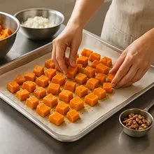 Line a large baking tray with parchment paper. Spread the marinated pumpkin on it in a single layer. It is important that the pieces do not overlap, which will allow them to roast rather than steam. Place the tray in the preheated oven and bake for 20-25 minutes. The pumpkin is ready when a fork easily pierces it, and the edges of the pieces are slightly browned and caramelized. After baking, remove the tray from the oven and let the pumpkin cool completely.