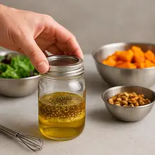 In a small jar with a lid, place all the dressing ingredients: 4 tablespoons of olive oil (about 60g), freshly squeezed lemon juice, honey, Dijon mustard, and a pinch of salt and pepper. Tightly close the jar and shake it vigorously for about 30 seconds. You'll see how the ingredients combine into a smooth, creamy emulsion. Taste the dressing and adjust the seasoning if necessary – you can add more honey for sweetness, lemon juice for acidity, or salt.