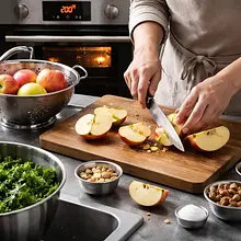 A traditional, seasonal salad combining the sweetness of roasted apples with slightly bitter kale and crunchy walnuts, dressed with a honey-mustard dressing. This dish comes from European cuisine inspired by simple autumn flavors: roasted fruits, nuts, and blue cheese. The salad is both hearty and light, making it a great appetizer or side dish for roasted meat, as well as a standalone lunch option. The vibrant colors – dark green kale, golden apples, and brown walnuts – are eye-catching and look great on the table.