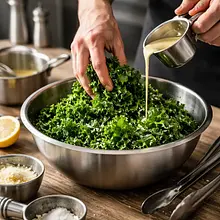 If the kale is very tough, place it in a large bowl, add 5 g of oil (about 1/3 tablespoon) and a pinch of salt (1 g), then massage the leaves with your fingertips for 2–3 minutes until the leaves soften and lose some volume. Massaging makes the kale more tender, less fibrous, and easier to absorb the dressing.