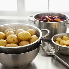 When the potatoes are cooked, drain them immediately. While they are still very hot, but cool enough to handle (use an oven mitt or a clean cloth), peel them. Pass the hot potatoes through a potato ricer directly onto a work surface or into a large bowl. If you don't have a ricer, you can use a meat grinder or mash them very thoroughly with a masher. Spread the potato mixture in a thin layer and leave it to cool completely (about 30-40 minutes).