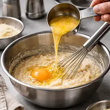 Add 120 g of eggs (2 pieces), crack one whole, and lightly beat the other, adding it gradually. Pour in 60 ml of cold water, tablespoon by tablespoon, mixing with a fork or silicone spatula until the dough starts to come together. Do not knead for too long — just enough for the ingredients to combine.