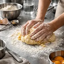 When most of the flour has combined with the eggs, start kneading the dough by hand. Knead it vigorously for about 10 minutes, pushing the dough away from you with the base of your palm, then folding it in half and turning it 90 degrees. Repeat this motion. The dough is ready when it becomes smooth, elastic, and springy. When pressed with a finger, it should slowly return to its shape.