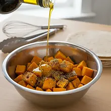 Transfer the chopped pumpkin to a large bowl. Add one tablespoon of olive oil (15g), one teaspoon of dried thyme, and two pinches each of salt and pepper. Mix thoroughly by hand, ensuring each piece of pumpkin is evenly coated with oil and spices. Spread the pumpkin in a single layer on a large baking sheet lined with parchment paper. Bake for 20-25 minutes, until the pumpkin is tender and slightly caramelized at the edges.