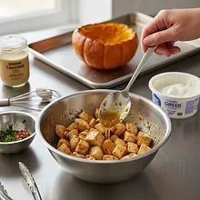 While the pumpkin is baking, prepare the chicken. Wash the chicken fillets and dry them thoroughly with a paper towel. Remove any membranes and bones. Cut the meat into cubes about 2-3 cm on each side. In a medium-sized bowl, prepare the marinade: combine two tablespoons of honey, two tablespoons of Dijon mustard, one tablespoon of olive oil (15g), smoked sweet paprika, two pinches of salt, and one pinch of pepper. Peel two cloves of garlic and crush them or chop them very finely, then add to the marinade. Mix well.