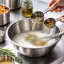 Pour 80 ml of chilled aquafaba into a bowl. Add 20 ml of cooled rosemary syrup (taste it: the foam should be aromatic but not overpowering). Whip with a hand frother or a mixer on high speed for 2–4 minutes until a thick, stable foam forms with a consistency similar to stiffly beaten egg whites.