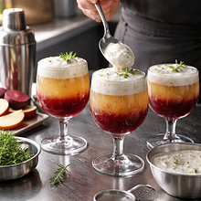 Serve in tall, clear glasses to showcase the layers. Ensure strong color contrasts: the intense purple beet and golden apple juice look best against the white foam. When serving for a group, prepare the syrups and foam in advance, and layer just before serving.
