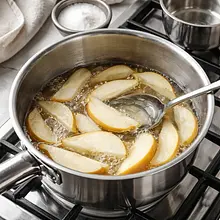 Cooking the syrup: place the chopped pears, 80 g of sugar, 250 ml of water, sliced ginger (20 g), and 1 cinnamon stick (6 g) into a medium saucepan. Set the saucepan over medium heat, bring to a gentle boil, then reduce the heat and simmer for 12-15 minutes, stirring every 2-3 minutes. The fruit should soften (check with a fork — it should go in easily) and the liquid should thicken slightly. The syrup is ready when the liquid starts to coat the spoon and leaves a thin layer.
