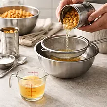 Prepare the aquafaba: drain the contents of the chickpea can and set the liquid (aquafaba) aside. Measure 120 ml of aquafaba and pour it into a clean metal or glass bowl. Add 30 g of powdered sugar. Using a hand mixer or a stand mixer, whip on high speed for 3–6 minutes until the mixture becomes white, glossy, and forms stiff peaks (similar to whipped egg whites). You can check if the foam is ready by gently turning the bowl upside down — the foam should not move.