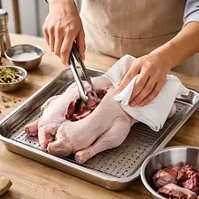 Prepare the duck: remove the innards (if any) and dry the duck inside and out with paper towels. Rub the inside and skin with a mixture of 6 g of salt and a pinch of pepper (about 1 g). Carefully fill the inside of the duck with the prepared stuffing — do not pack it too tightly, the filling should fill the cavity loosely, allowing heat to circulate evenly. Sew or secure the cavity with toothpicks to prevent the stuffing from falling out.