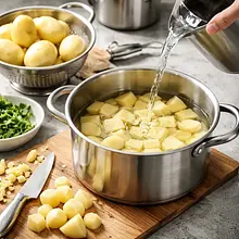 Prepare the dumplings: peel the potatoes and cut them into even pieces. Place them in a pot, cover with cold water (1–2 cm above the potatoes) and add 5 g of salt. Cook over medium heat for 20–25 minutes from the moment of boiling, until the potatoes are soft (check with a fork — they should fall apart easily). Drain and pass through a ricer or mash thoroughly with a potato masher; leave in a warm place to let the steam escape (about 5 minutes). To the hot potatoes, add the sifted potato flour (120 g) and one raw egg (60 g). Quickly mix with a wooden spoon until the dough becomes cohesive and slightly sticky. Shape with your hands (lightly greased with oil or wet) into balls the size of walnuts, making a slight flattening and indentation in the center of each dumpling with your finger. Cook the dumplings in batches in a large amount of salted, boiling water; gently drop them in, and once they float, cook for 2–3 minutes until they are elastic and smooth.