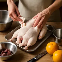 Take the duck out 30 minutes before roasting to reach room temperature. Preheat the oven to 220°C (fan mode not recommended for the initial stage). Place the rack in the roasting pan so that the fat can drain. If you have a kitchen thermometer, insert it into the thickest part of the thigh (you will check the temperature later).