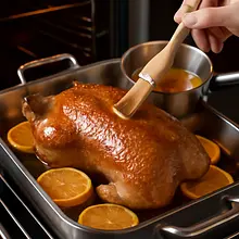 Reduce the oven temperature to 160°C. Weigh the duck and plan the remaining cooking time: roast for an additional 20–25 minutes for every 500 g of the bird (for a 2 kg bird, this is about 80–100 minutes). During roasting, baste the duck with the sauce/fat from the roasting pan every 20–25 minutes to prevent the skin from drying out and to give it a nice shine.
