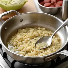 Shred the cabbage into thin strips. Peel the onion and chop it into small cubes. Slice the sausage.