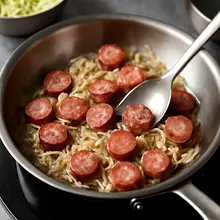 Braised cabbage with sausage is a classic dish of Polish cuisine, combining tender cabbage with aromatic sausage. Fried onions and butter add depth of flavor, while the spices enhance the overall taste. Simple and quick to prepare, perfect for a hearty lunch.