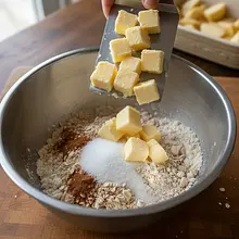Take 80g of very cold butter out of the fridge. Cut it into small cubes (about 1x1 cm) and add it to the dry ingredients. Now for the most important moment: using your fingertips, quickly rub the butter into the flour, sugar, and flakes. Lift the ingredients up and let them fall, rubbing them between your fingers. Do this until clumps resembling wet sand with larger pieces the size of peas form. Do not knead the dough for too long!