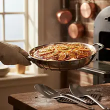 Carefully remove the pan from the oven and set it aside for 5-10 minutes. This is a very important step – the cake needs to 'rest' for a moment, and the caramel should cool slightly, but it must not harden completely. After this time, cover the pan with a large plate or serving platter, and then, holding the pan and the plate firmly at the same time (using oven mitts!), quickly and decisively flip everything upside down. The cake should fall onto the plate. If any pieces of apple remain in the pan, gently transfer them onto the cake.
