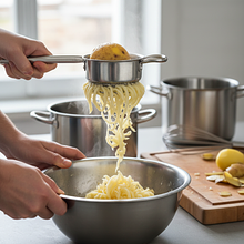 While still hot, pass the potatoes through a potato ricer or mash them very thoroughly with a masher until you have a smooth mixture without lumps. Transfer the mixture to a large bowl. Level the surface with a spoon. Then, using a knife, divide the mixture in the bowl into four equal parts. Remove one quarter of the potatoes and set it aside (you can place it on top of the remaining potatoes). In the empty space, pour in the potato starch until it fills the space to the brim. Add back the set-aside portion of potatoes, crack in an egg, and add half a teaspoon of salt.