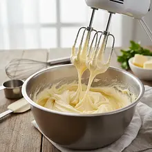 W drugiej, dużej misce umieść miękkie masło (w temperaturze pokojowej) oraz cukier. Używając miksera ręcznego lub planetarnego z końcówką do ucierania, miksuj składniki na średnich obrotach przez 5-7 minut. Masa powinna stać się bardzo jasna, niemal biała, i puszysta jak krem. Regularnie zgarniaj masę ze ścianek miski za pomocą silikonowej szpatułki.