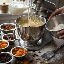 Odsącz namoczone bakalie na sicie, pozbywając się nadmiaru płynu. Dodaj je do miski z ciastem. Używając silikonowej szpatułki, delikatnie wmieszaj bakalie w ciasto, wykonując ruchy od dołu do góry. Mieszaj tylko tyle, aby bakalie równomiernie rozłożyły się w masie.