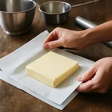 Prepare the butter for the layers: place the remaining 300 g of butter on a sheet of parchment paper, cover it with another sheet of parchment paper, and hit it with a rolling pin or the bottom of a saucepan to flatten and spread the butter into a rectangle measuring about 18–20 cm × 12–15 cm and about 1–1.5 cm thick. The goal is to create a flat, even block of butter with similar proportions to the rolled-out dough. Roll vigorously, but do not warm the butter — work quickly.