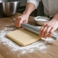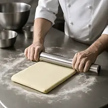 After closing the butter, gently press the folded package with your hand to seal the edges. Make sure the seams are on the bottom. Lightly sprinkle the work surface with flour and gently roll the folded package into a rectangle about 60 cm long and 20 cm wide — always roll from the center outwards to avoid pushing the butter out of the dough. Rolling should take 1–2 minutes until you achieve a smooth rectangle; if the dough starts to stick or the butter is protruding too much, place it in the refrigerator for 10–15 minutes.