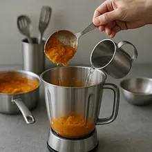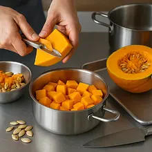 Start by preparing the vegetables. Peel the pumpkin, remove the seeds, and cut the flesh into cubes about 2 cm on each side. Peel the potato and also cut it into cubes. Place both vegetables in a pot, cover with water just to their level, and cook until soft, about 15-20 minutes. Alternatively, you can steam them, which will prevent excess water absorption. After cooking, drain the vegetables very thoroughly in a colander and let them sit for a few minutes to steam off. Transfer to a large bowl and mash with a potato masher until smooth purée.