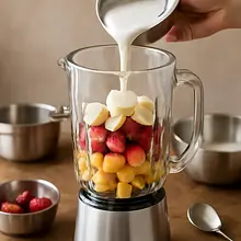In the blender jar, first add the chopped fruits (mango, strawberries, banana), then add yogurt and orange juice along with 30 g of honey. Finally, add 100 g of crushed ice (you will leave the rest for serving). Close the blender and blend on medium-high speed for 60-90 seconds until the mixture is smooth and creamy. If the blender has a pulse function, start with 3-4 pulses, then blend continuously. If the smoothie is too thick, add 30-60 ml of juice or water and blend for another 10-15 seconds; if it's too thin, add more mango or ice in increments of 20 g at a time.