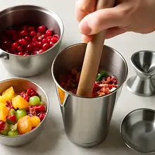 Gently crush the fruits with a cocktail muddler or the end of a wooden spoon for 20–30 seconds — the goal is to release the juices and aromas, not to completely break them down. The fruits should remain visible as pieces, and the juice that flows out should lightly tint the bottom of the container.