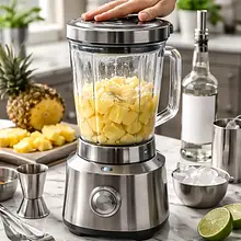 Blend the cocktail: in a blender jar, place 300 g of chopped pineapple, 120 ml of white rum, 30 ml of lime juice, 30 ml of prepared syrup, and 100 g of crushed ice (about half the amount of ice). Blend on high speed for 25–35 seconds until the mixture is smooth and uniform, without larger pieces of fruit.